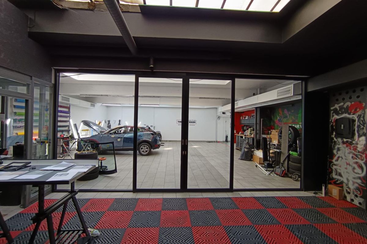 Une demande spécifique de notre client a été la réalisation d’une porte vitrée coulissante toute hauteur à deux vantaux, offrant une large ouverture de plus de 200 cm. Cette configuration permet un passage fluide des véhicules d’une zone à l’autre, alliant design, fonctionnalité et robustesse.